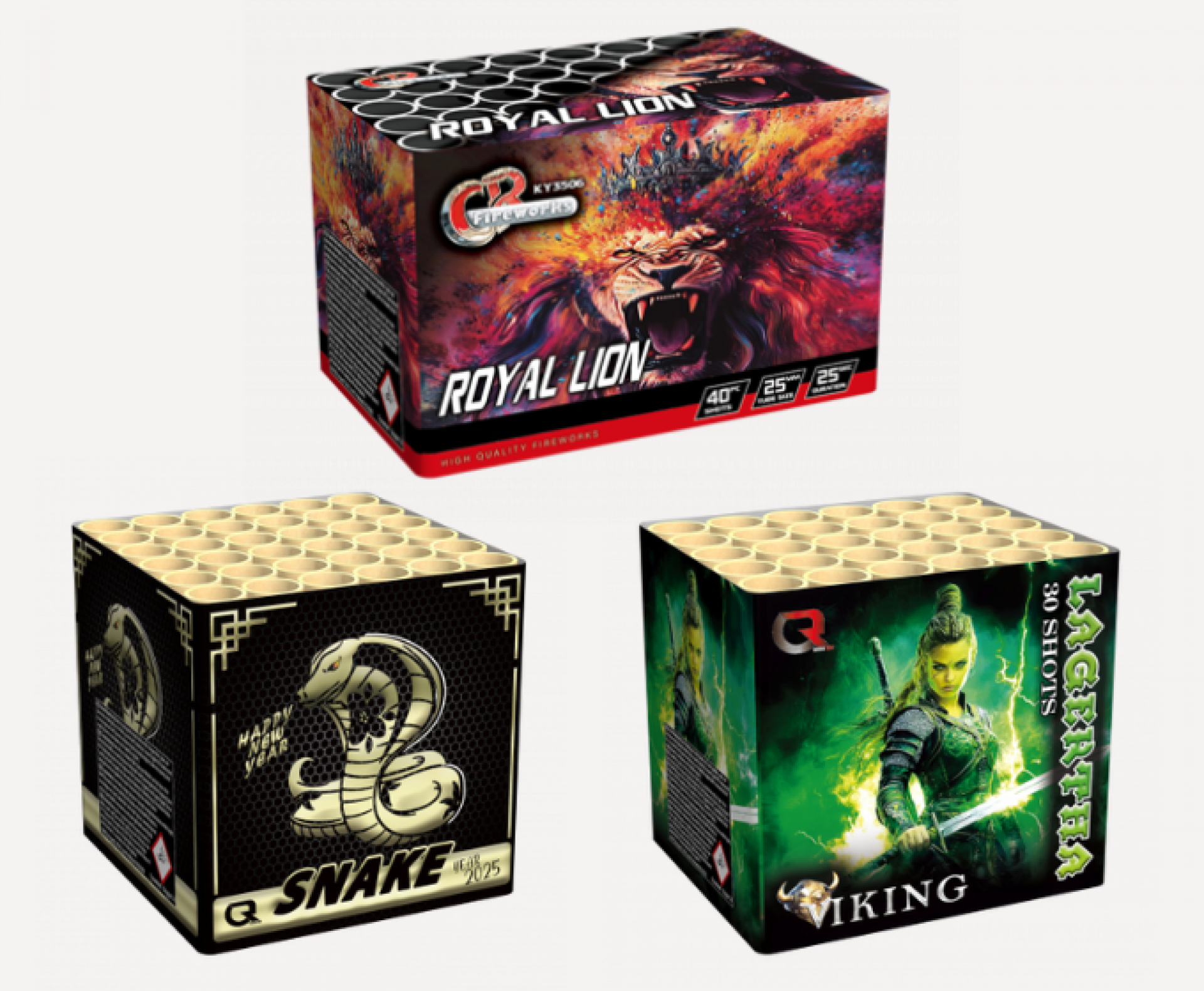ROYAL LION – een 40-schots cake vol kracht en elegantie. Rijke kleuren, stevige bursts en een vurige finale maken dit een koninklijke vuurwerkshow voor elke liefhebber.